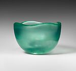Meaning corroded, corrosi is a cold working technique that uses hydrofluoric and sulphuric acid in solution to give the glass an irregular surface texture. Changes in temperature, the amount of time the glass is exposed to the acid bath, and the composition of chemical agents can lead to a variety of effects. Areas of the glass that are to be kept smooth and bright can be covered with wax or paraffin prior to submersion. Ultimately, this method yields an inconsistent surface texture that both diffuses and reflects light for a fluctuating, iridescent effect. This bowl’s green color and curved lip give it the appearance of an ocean wave transferred into glass.