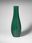Rigati e Tessuti is Carlo Scarpa’s interpretation of the mezza filigrana technique. In mezza filigrana, clear glass rods are fused with a piece of lattimo (milky) or colored glass. Here, instead of using clear glass, Scarpa used only rods of colored glass to give each piece a colorful, linear texture. Rigati involves the cold-joining of rods that are subsequently hot-joined and shaped into the final design using a mold of glassmaker tools. Tessuti glass is blown and shaped using a "fabric" (tessuto) of hot-joined colored rods. Sometimes, this form is then covered in a thick layer of clear glass, resulting in what is known as Tessuto sommerso. Here, colored rods serve to emphasize this piece’s verticality as it expands and then delicately tapers towards the top.