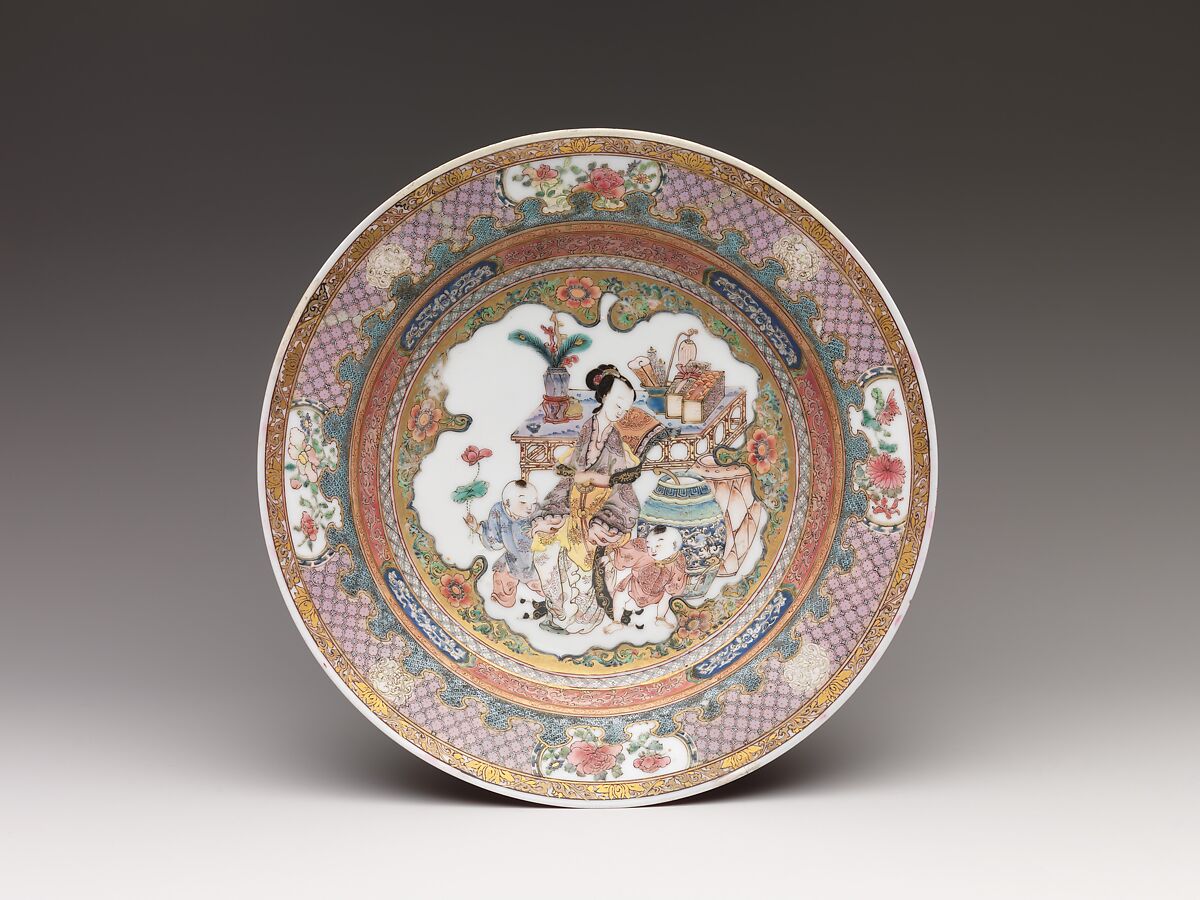 Qing-dynasty porcelains painted with overglaze enamels are often catalogued and dated according to the colors of their palettes using a system first devised in the nineteenth century by a French scholar. Porcelains painted in shades of pink are fittingly known as famille rose. In this dish—whose subject is the popular theme of a woman and children surrounded by luxuries—pink is used for the children's clothing and in one of the borders that frames the charming scene.