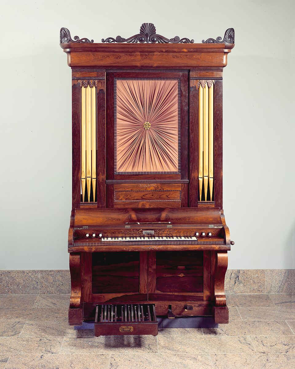 Technical description: Rosewood case with cornice surmounted by carved ornaments, frontal framed cloth panel flanked by flats both of 3 dummy pipes with carved shades, single C-c4 ivory and ebony manual with plainwood fronts, flanked by 3 stopknobs on each side controlling 4 ranks (specification on separate card), key desk enclosed by curved fallboard holding music support, keybed supported by curved brackets flanking access panels, 13-note pedalboard in drawer at bottom left, coupled to bottom octave of manual by pulldowns, all pipes under expression controlled by swell pedal, wind supplied by separate pedal or by hand lever at right side, wind indicator in slot over keyboard, silver name plaque centered over keyboard. (Laurence Libin, 1987)