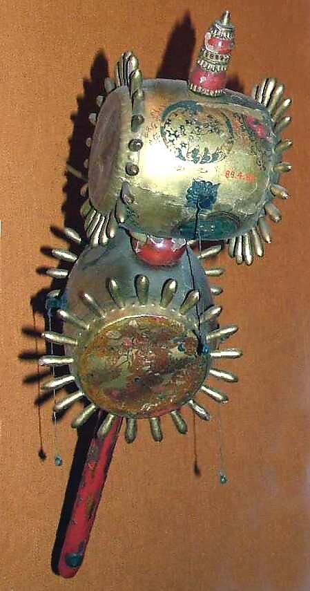 This double pellet drum, rarely used today, was used in Shinto processions and dances. Beads at the ends of the string strike the drum's heads when the handle is twisted.