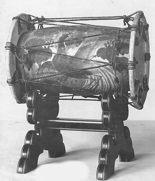 This drum, introduced to Japan from China in the 7th century is struck with two thin sticks by a kneeling musician and is used to set the rhythm for togaku (early Tang dynasty music). Occasionally it is used in geza (off stage music of the kabuki theatre) to evoke the imperial court.