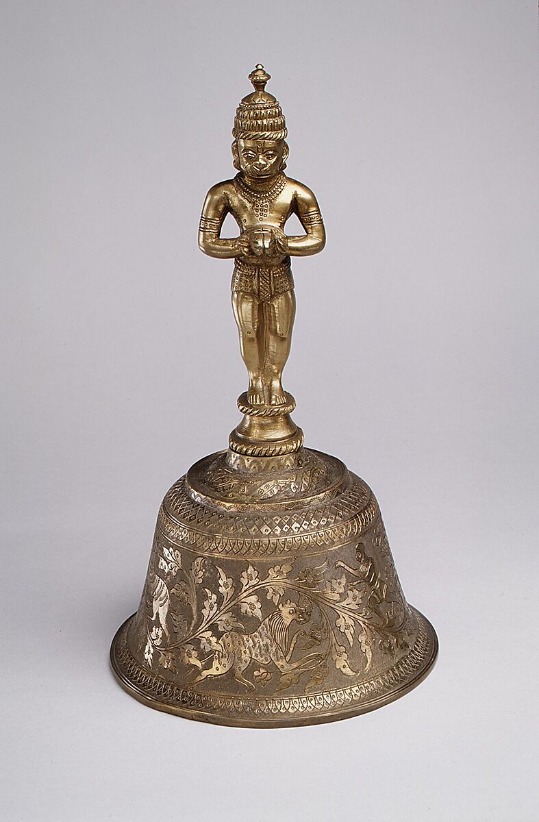 The handle of this bell consists of a finely wrought figure of Hanuman, the famous monkey general who, in Hindu mythology, led the army that helped Rama rescue his wife, Sita, from Ravana. The body of the bell is richly engraved with additional figures and floral designs. Priests use ghanti of different sizes to worship and pay homage to a god. This worship may occur in a temple or privately at home before the household shrine.