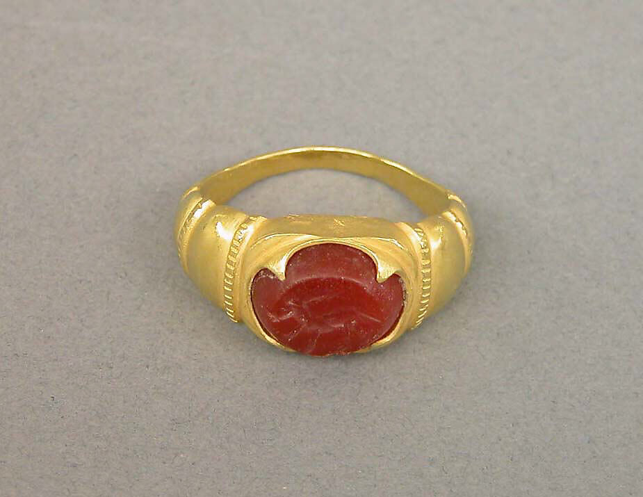 - Title: Ring with Ridged Segments and Inset Red Stone
