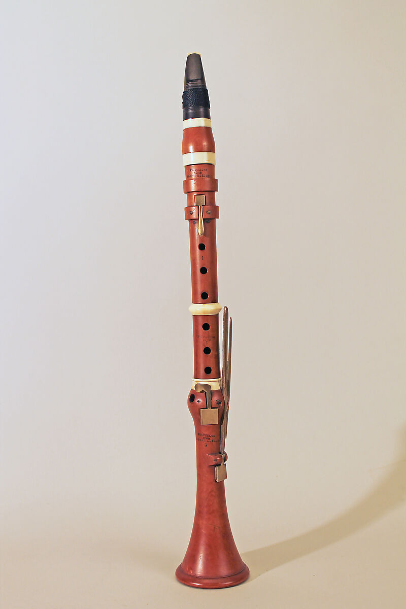 Technical description: Boxwood with ivory ferrules and brass keywork. Five pieces: mouthpiece, barrel, upper section, middle section for the fingers of the right hand, lower section with keys and integral bell. Unstamped blackwood mouthpiece grooved for cord. Barrel unstamped. Speaker liner projects ca. 2 mm into the bore. Levers for L4, tone-hole and key for R4 mounted in a fusiform swelling. Integral wooden rim. Three short keys SATB, two long keys SATW, a combination that is often found on French instruments of this period.