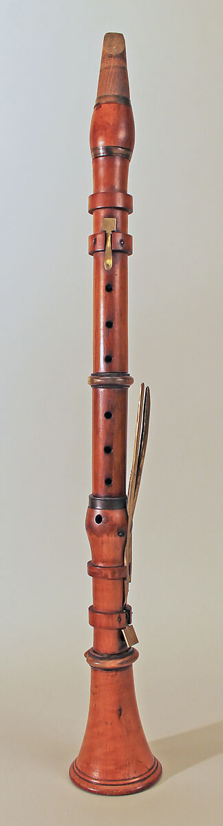 Technical description: Fruitwood (?) with horn ferrules and brass keywork. Six pieces: Mouthpiece, barrel, upper section, middle section for the fingers of the right hand, lower section with keys, bell. Rough long-tenon mouthpiece. Barrel does not have sockets; bore of barrel rough. No speaker liner. Square turned wooden rings are German style, 18th century. So is the mounting of the E3/B♮4 flap. F♯3/C♯5 guided in a square ring. SATK. Very small, crude, and rather unfinished bore. Levers for L4, tone-hole and key for R4 mounted in a fusiform swelling.