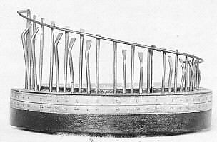 Technical description: A C-shaped open arc of blackened, varnished wood with a varnished spruce "soundboard" attached over one side with 14 brass nails; between the edge of the soundboard and the outer circumference of the arc, 30 pins are driven to graduated heights, their flattened tops protected by a semicircular brass wire; a printed paper label glued around the side of the arc identifies each pin with a pitch letter and solfège syllable; natural pitches have straight vertical steel pins, accidental pins are brass, driven at a slight outward angle and bent inward just below the flattened tops. Played with a bow (missing). Range (not confirmed) C-F. (Linda Moot, 1978)