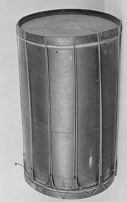 Technical description: The drum shell is made of two pieces of wood fitted together horizonally and painted black, rope tension, originally with twelve leather tugs (seven missing). Wood rims, painted black, with twelve drilled holes through which the rope passes. A hook, hole in the shell, and two holes in the rim are aligned vertically with snare marks on the drumhead, indicating that at one point there was a snare strainer mounted vertically, parallel to the shell. Calfskin heads. Marks on the bottom head indicating there were at least two snares on this drum at one point during its history. Opposite the strainer is a small knob, probably a harp or guitar peg, made of dark wood with a bone tip over which the snares looped.
