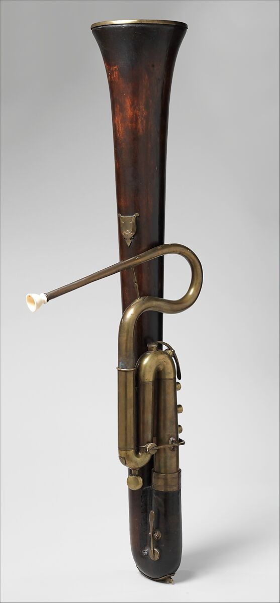 The serpent, a wide bass brass horn with finger holes that evolved at the end of the sixteenth century, gained importance in band music during the second half of the eighteenth century. Thenceforth, the serpent's unwieldy shape was either modified or converted to upright forms. This version, with four keys and six fingerholes, was designed and first publicly displayed in Paris in 1823.
