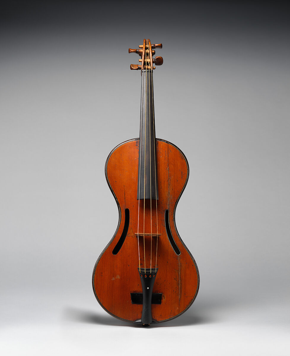 Chanot-type cornerless model, one-piece spruce belly of wide, irregular grain with oblong soundholes edged with black and white stripes (one white stripe missing); one-piece quarter-cut maple back with figure slanting left to right, figured maple ribs, brittle yellow varnish; purfling maybe ebony and synthetic; ebonized hardwood edging; figured maple neck; pegbox and reversed scroll; old boxwood pegs, stained pear fingerboard, top and back not overhanging; strings originally secured to belly, now converted to tailpiece and original fastener replaced by piece of ebonized hardwood; saddle and endpin also later, Accompanied by an inexpensive German bow, Bausch school, mid-19th century.