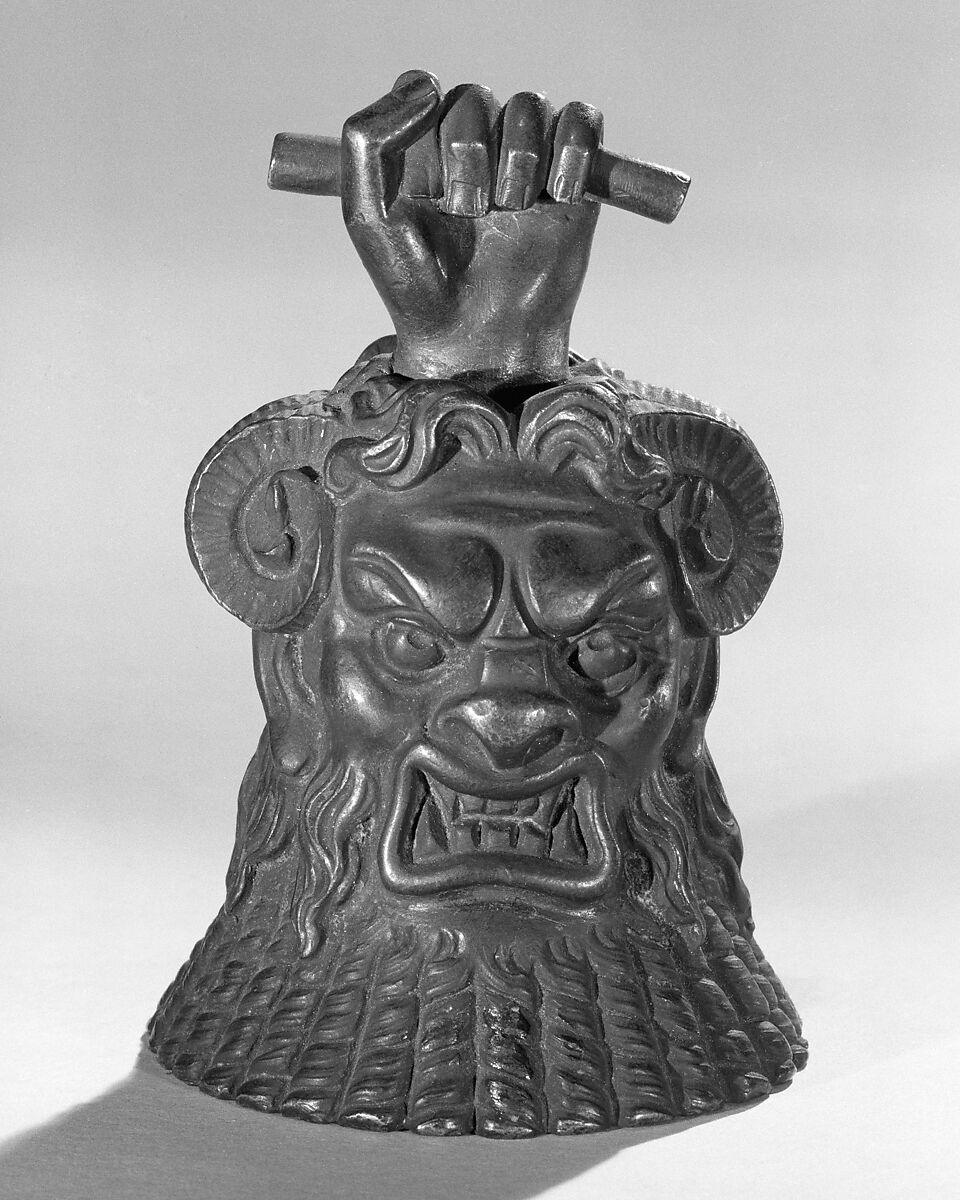 In the 19th century, interest in ancient Egypt swept Europe following Napoleon's campaigns (1798-1801). This highly stylized clapper bell features the face of the Egyptian deity Bes, along with attributes not normally associated with him including rams horns and the 'Wand of Horus' (fist grasping a small rod).