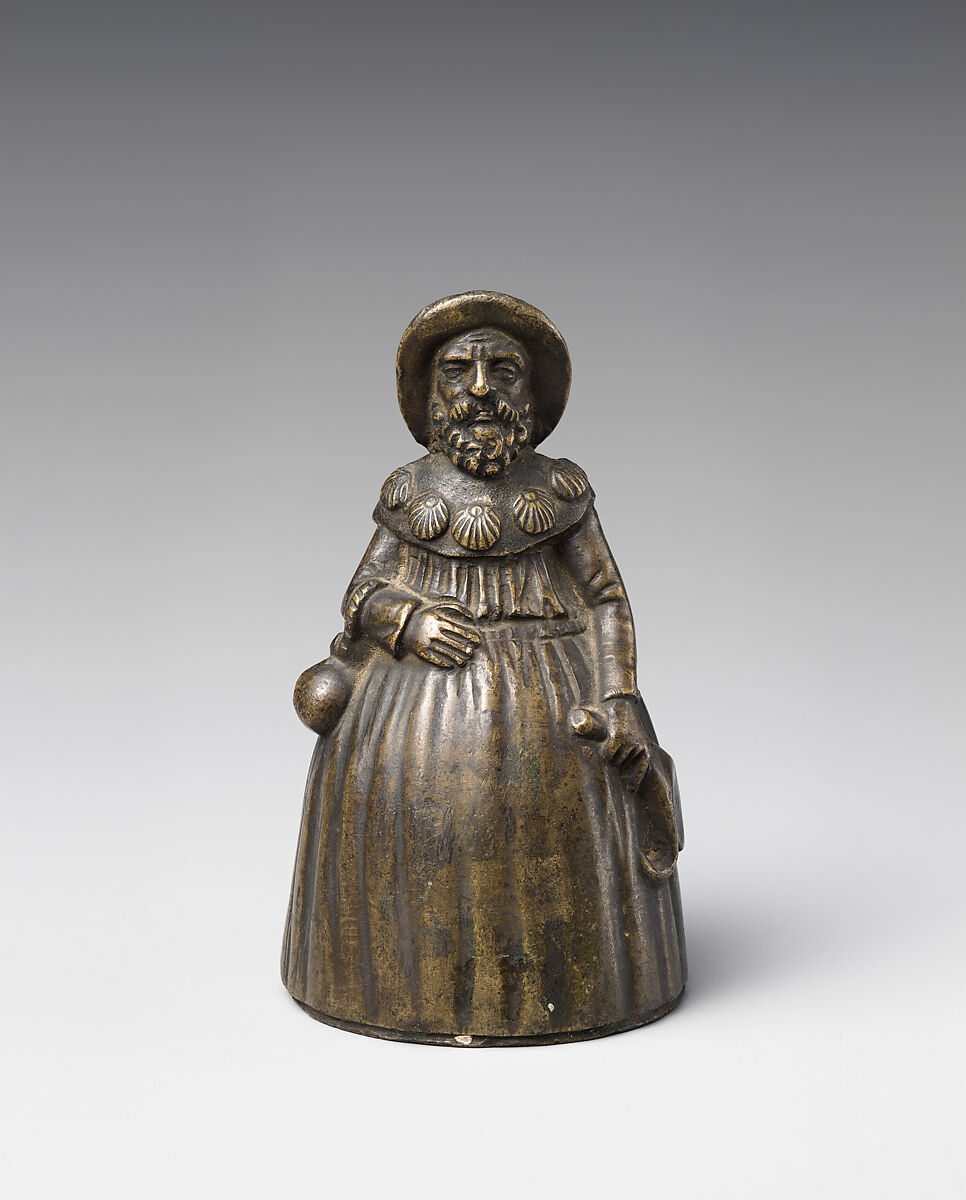 This bronze bell depicts a pilgrim to Santiago de Compostela dressed in the robe, hat and scallop shell collar. He carries a water gourd on his right arm and an unidentified object (scrip?) in left hand. It sound C# when rung.