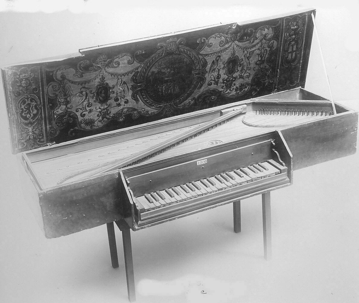 Technical description: Inner-outer case construction, the inner case and soundboard of cypress, rectangular shape with right rear corner cut off, protruding keyboard, no bottom exterior molding, top exterior molding only on the front side, outer case of painted deal; compass originally 50 notes, C/E-c3, with five split accidentals (F-sharp/ D, G-sharp/E, g-sharp, d1-sharp, g2-sharp), now 47 notes, with the three upper split accidentals removed (the three extra jacks are still present, but do not sit on a lever), jacks are modern replacements, boxwood naturals with boxwood arcades, black-stained hardwood accidentals, the seven lowest keys have signs of previous pull-down cords, keys guided by wooden slips in rear rack; pierced parchment rose in soundboard. (Douglas Maple, 1983)