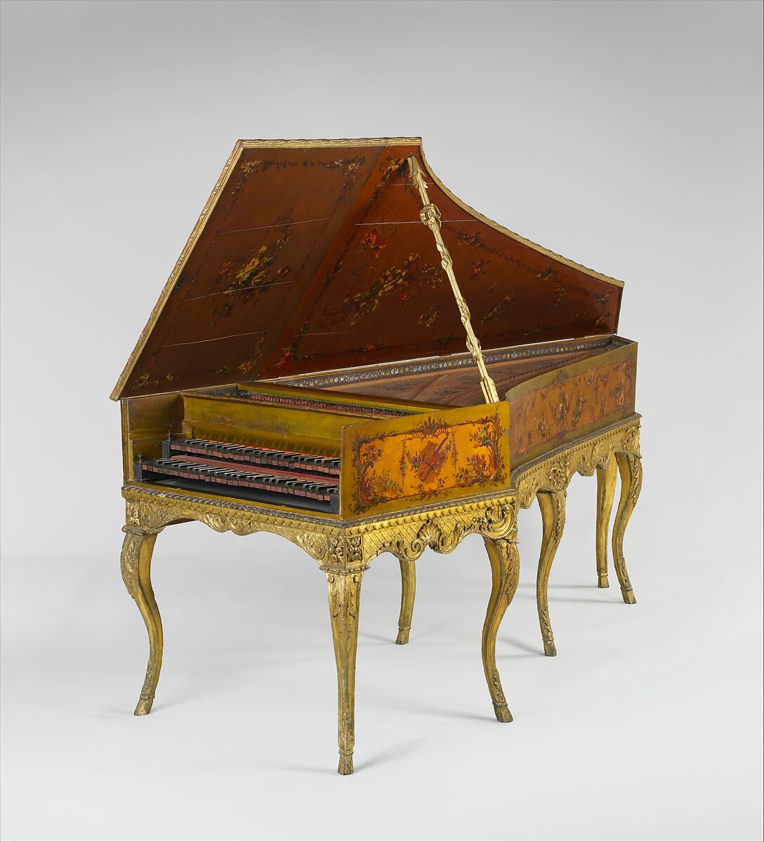 Technical description: Case of poplar or lime, exterior decoration of speckle gold in varnish and painted floral designs may not be original; double manual, GG-e3, 2x8', 1x4', buff, upper manual slides in to couple; ebony naturals with pearwood arcades, accidentals of black-stained alizier covered with bone plates; jacks of alizier, tapered, originally with bristle springs, restorer ca. 1900 changed to brass leaf springs and added lead weights; leather-covered jack slides and guides; lower manual guided by metal pins in rack, upper manual by pins in mortises in rear of levers; stop levers on wrestplank behind nameboard; carved and gilded stand with seven cabriole legs; soundboard decorated with cast metal rose, paintings of flowers, insects, and a bird. (Douglas Maple 1983)