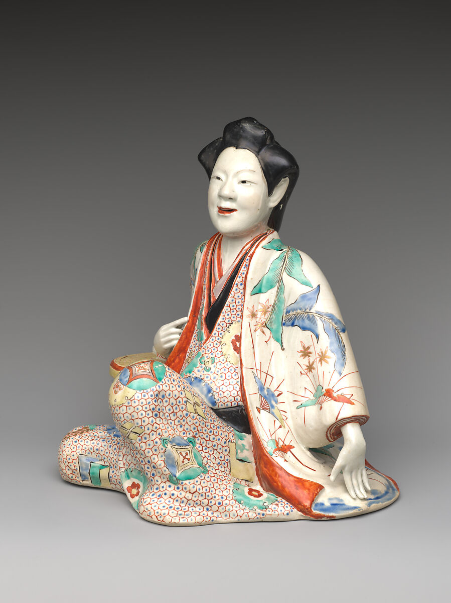 This graceful figure reclining against an armrest is thought to represent a beauty or courtesan who may have enjoyed great popularity during the Kanbun era (1661–73). Her dignified composure conveys a sense of refined confidence. A similar pose is seen in contemporary paintings of beauties, suggesting that this porcelain sculpture was inspired by pictorial trends. The woman’s hair is arranged in the tokō style, and she wears a kosode robe patterned with auspicious motifs, under an opulent uchikake adorned with banana leaves, folding fans, and maple leaves. Although such figures were also collected within Japan, they gained popularity among European elites, who prized them as examples of Japanese export porcelain.