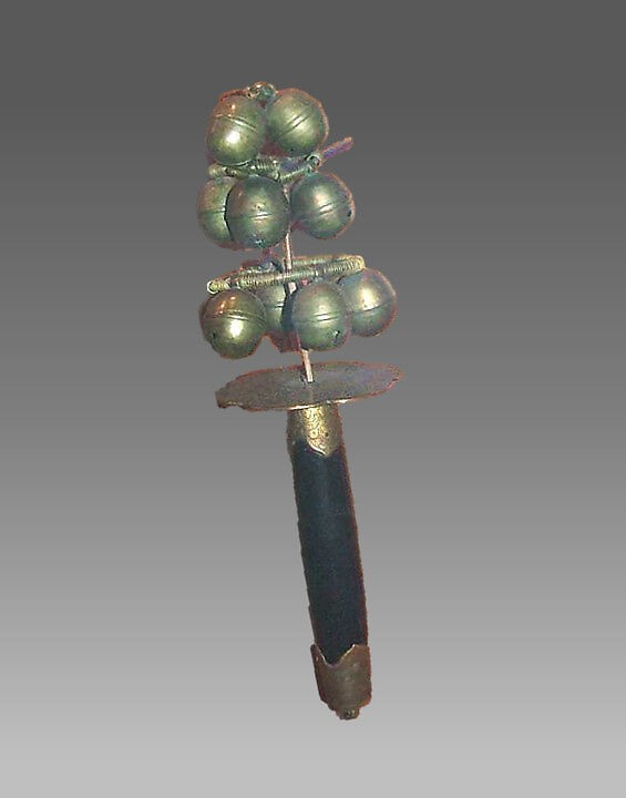 This bell tree is held by women dancers during the benedictory call, mikomai.