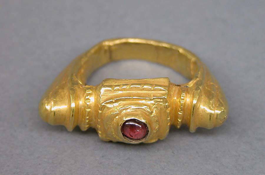 - Medium: Gold with reddish-purple stone