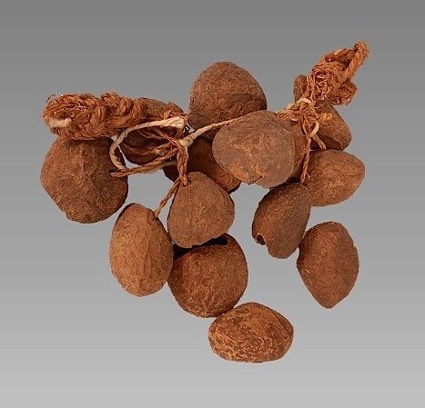 - Dimensions: Shells 3/4 inches in diameter (?), Width 1-1/2 in., 13 nut shells tied in two bunches of 6 x 7 each.
