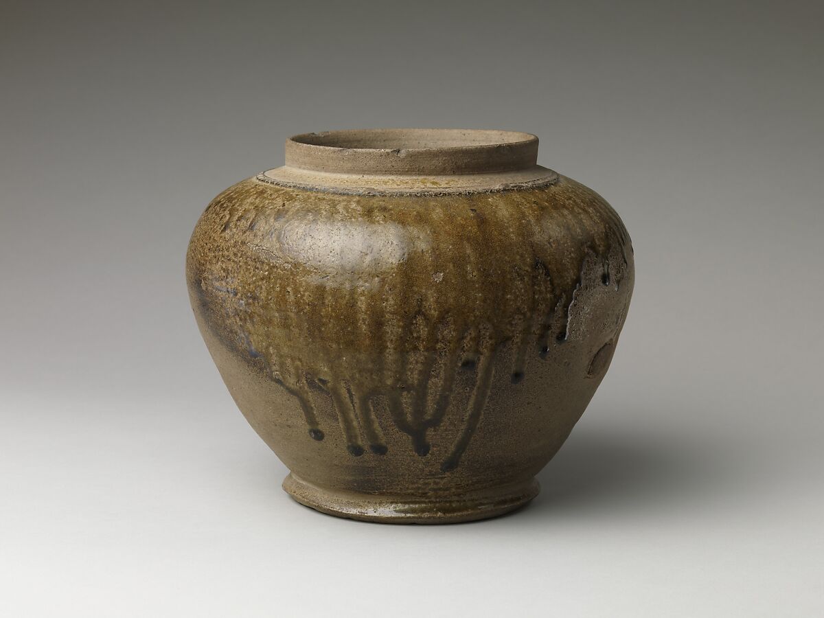 A large portion of Sue ware production was devoted to tableware regulated by centralized administrative standards. Potters abandoned the curving forms of the Kofun period (ca. 300–710) in favor of rectilinear profiles inspired by contemporary Chinese metalwork of the Tang dynasty (618–907). This jar, once fitted with a rectangular lid, exemplifies the storage vessels among these “state ceramics.” Its form derives not only from Tang prototypes but also from those of Korea’s Baekje Kingdom (18 BCE–CE 660) that were widely distributed during Japan’s adoption of cremation burial customs. Some jars of this type also served as containers for medicines. The glossy surface finish suggests that the vessel was created at the Sanage kilns, where from the mid-eighth century potters began positioning select wares in kiln “hot spots” to encourage natural ash glazing