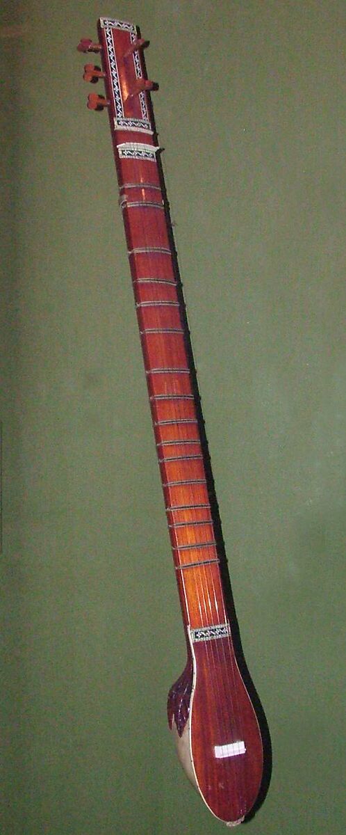 Small five-string sitar with a body is made of nautilus shell. More decorative than functional this instrument may have been displayed or occasionally played as a novelty.