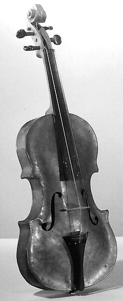 Technical description: Tarnished copper-alloy body comprising one-piece arched top and back screwed to internal longitudinal wood stiffening bars and with edges bent over and soldered to rib assembly; notchless F-holes; conventional soundpost, button, tailpiece, fingerboard, and bridge (stamped E.H. in oval); one-piece neck, pegbox, and scroll of oak; conventional but poorly fitting pegs.