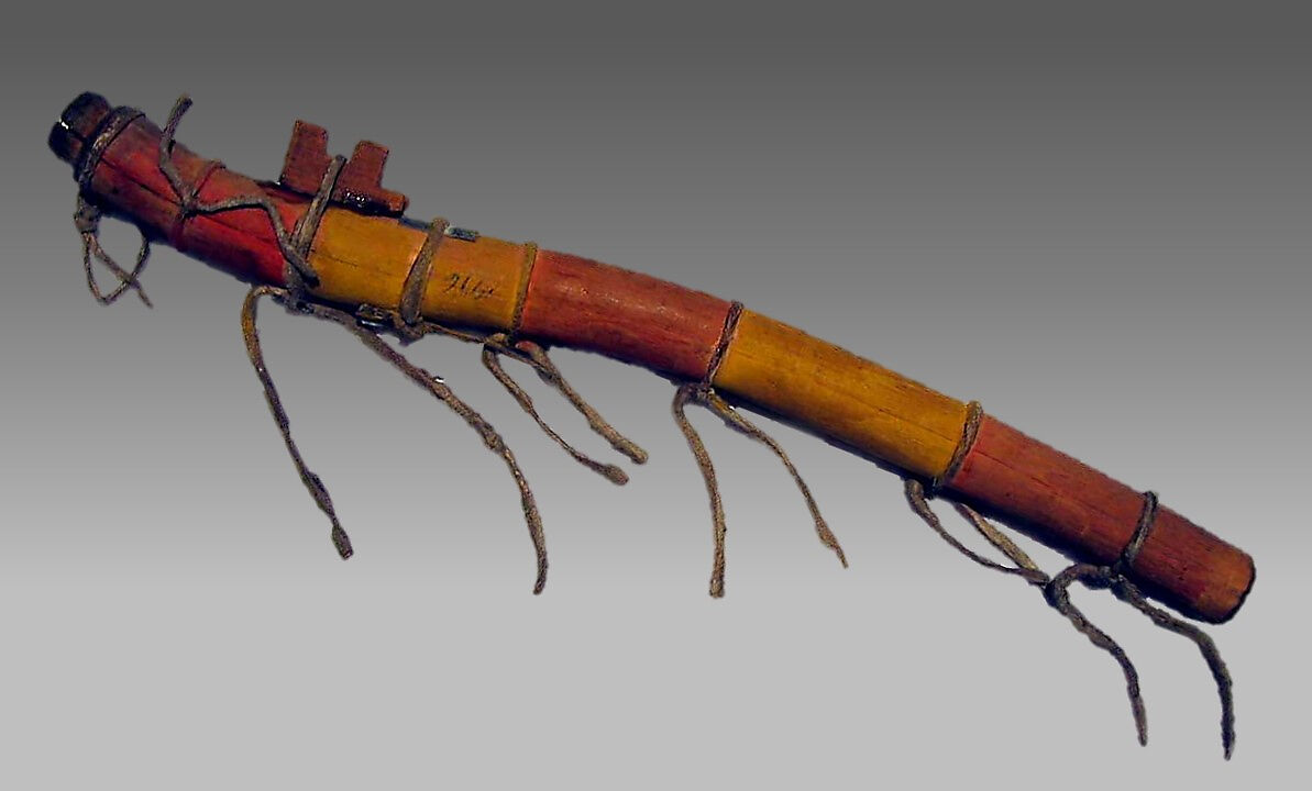 A Native American flute is divided by an internal plug into two chambers. The player's breath is routed out of the tube as it encounters the plug and is redirected to the second chamber by a thin metal spacer positioned under a block (often carved as an animal) secured by a cord. Formerly restricted to men in sacred ritual and courting contexts, it is today an instrument with a growing social and secular repertoire.