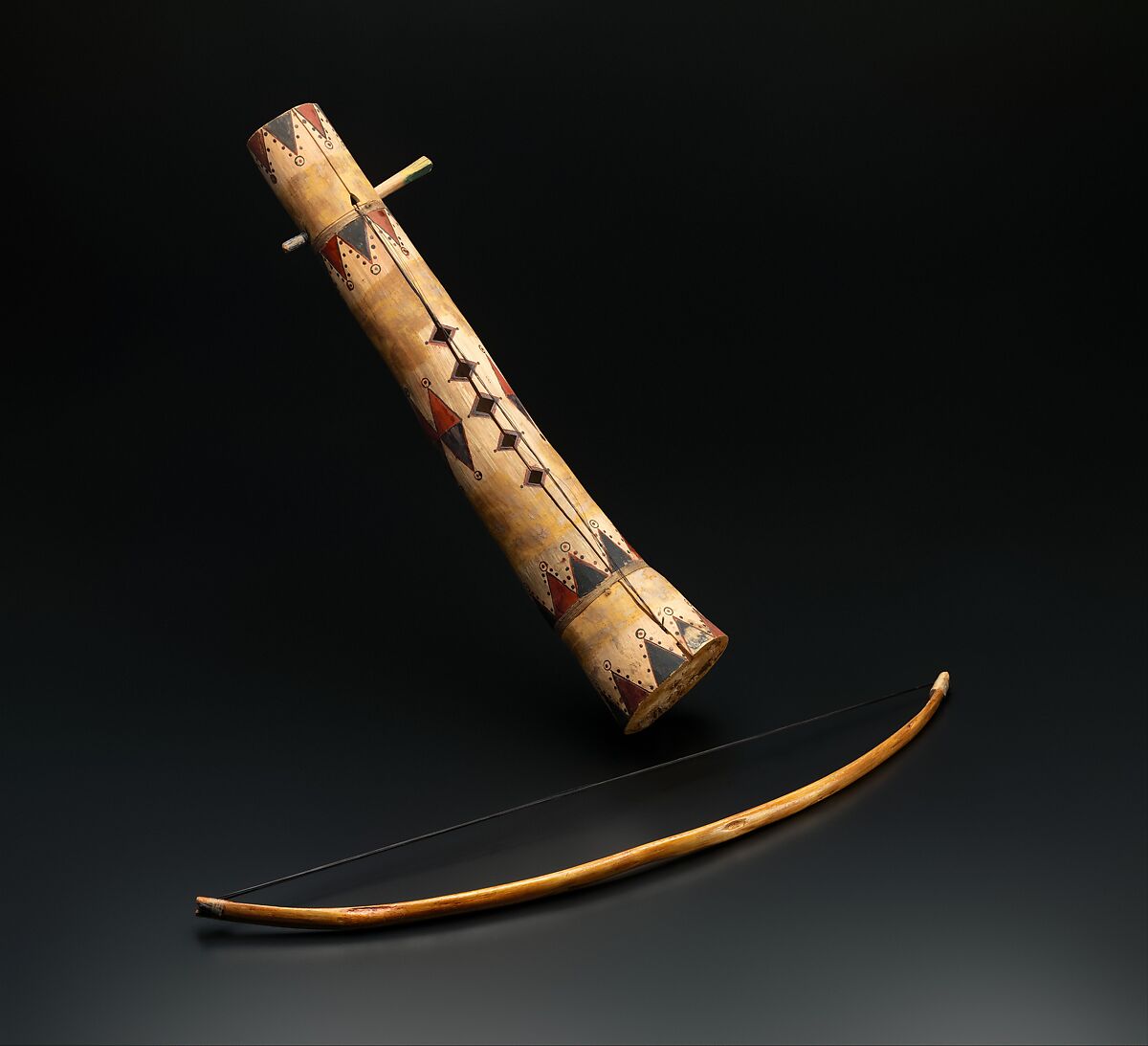 The Apache name for this two-stringed bowed zither means "wood that sings." Held against the chest or stomach and bowed like European fiddles, it is used for personal enjoyment or to entertain at home with songs and dances. The hollowed agave stalk body is decorated with traditional designs, and the strings attached to the ends of the tube are of horsehair. As it is the only Native-American bowed instrument, it remains unclear as to whether it is indigenous or of European derivation.