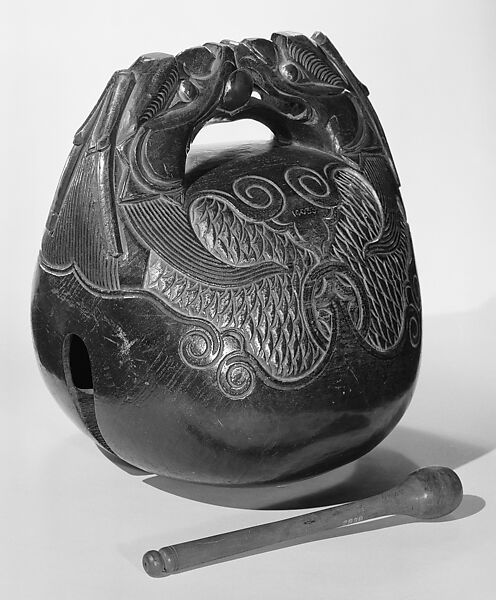 Small hand-held mokugyos, and large ones resting on cushions, are used to accompany chants (sutras) in Taoist and Buddhist ceremonies. The handles of this slit drums are decorated with stylized fish, which hold in their mouths a ball, symbol of the universe. Having no eyelids, the fish symbolizes wakeful attention and vigilance in devotion.