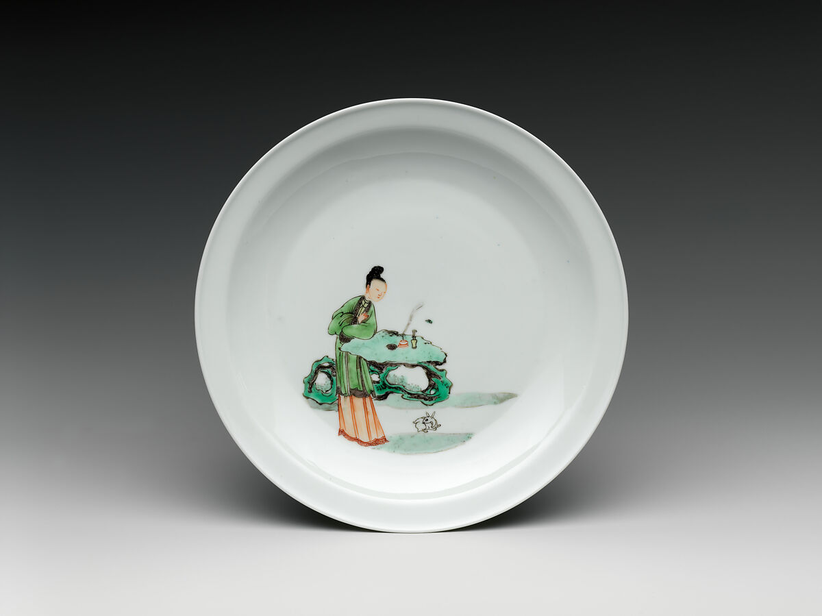 This finely crafted dish illustrates a scene from the popular play Prayers to the Moon, which tells the story of a young woman who is reunited with her missing husband after she prays to the moon goddess for his safe return. Her prayers are conveyed by the burning of incense. The rabbit, companion of the goddess, alludes to the moon.