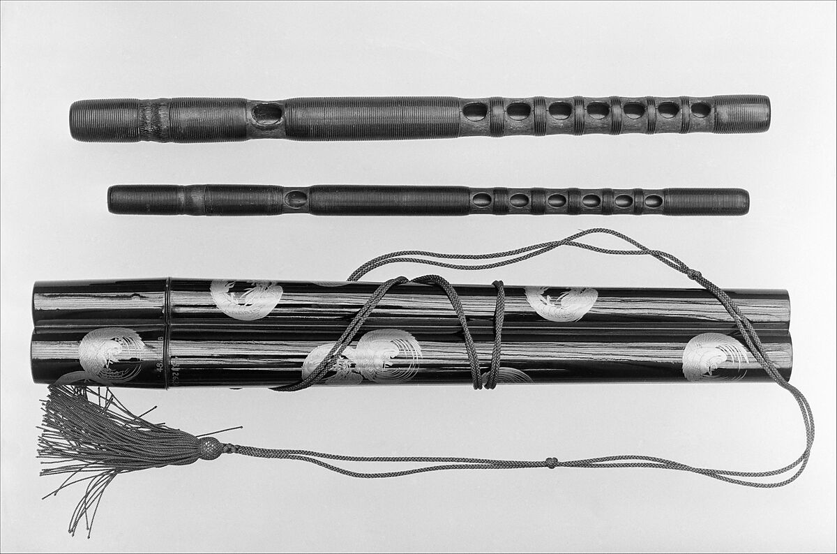 The black lacquered wood double case for a ryūteki and komabue is decorated with flying dragons, a reference to ryūteki which means "dragon flute".