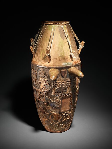 Drums like this were used by Ompe and Ntan music and dance clubs, which were popular in the 1930s and 1940s. These drums, seldom played today but still displayed in front of the ensembles as they perform, are decorated with designs that help establish the public identities of the organizations. The breasts, first documented in the 19th century, indicate the drum's role as "mother" of the ensemble. Other painted relief figures represent common proverbs, political statement, or satire. The proverb "only the elephant can uproot the palm tree" signifies a sense of power associated with the emblem, located in the dominant position below the breasts. In older drums, the symbol is placed in an inconspicuous position; but as the hope for independence strengthened, it replaced the British Royal lion which are now on either side of the breasts. "Be patient" is the proverb identified with the heart, just above the elephant; it seems to indicate that patience and strength are eventually rewarded with national self determination. A frame beneath the breasts formerly held a mirror. Some drums include a framed clock to indicate when the hired ensemble began to accrue overtime wages.