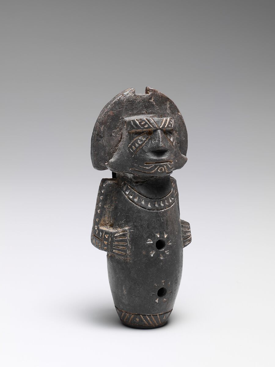 Flutes and bells are all that remain of many musical traditions of the Tairona people of the Sierra Nevada de Santa Marta region, Colombia. The importance of these metal, terracotta, and blackware instruments is evident in their carefully detailed incising and punctuation. The symbolic meanings of the effigies are obscure, and the relationship between the forms and their musical functions is unclear. It is believed that musical effigies served as talismans and were played to link the mortal and immortal realms.