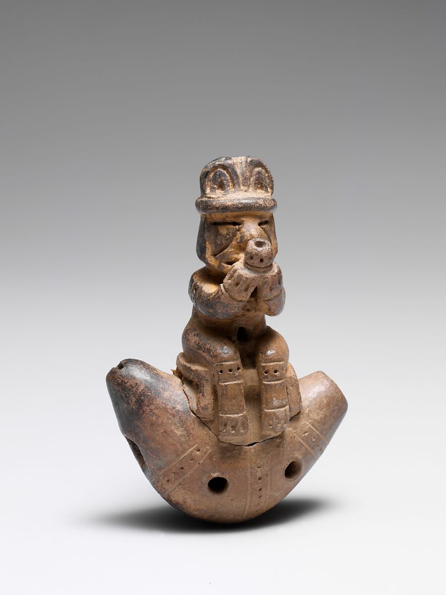 Flutes and bells are all that remain of many musical traditions of the Tairona people of the Sierra Nevada de Santa Marta region, Colombia. The importance of these metal, terracotta, and blackware instruments is evident in their carefully detailed incising and punctuation. The symbolic meanings of the effigies are obscure, and the relationship between the forms and their musical functions is unclear. It is believed that musical effigies served as talismans and were played to link the mortal and immortal realms.