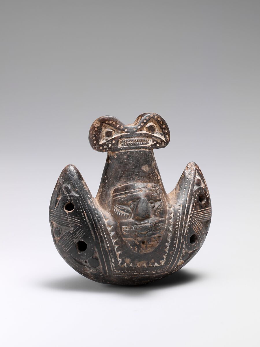 Flutes and bells are all that remain of many musical traditions of the Tairona people of the Sierra Nevada de Santa Marta region, Colombia. The importance of these metal, terracotta, and blackware instruments is evident in their carefully detailed incising and punctuation. The symbolic meanings of the effigies are obscure, and the relationship between the forms and their musical functions is unclear. It is believed that musical effigies served as talismans and were played to link the mortal and immortal realms.