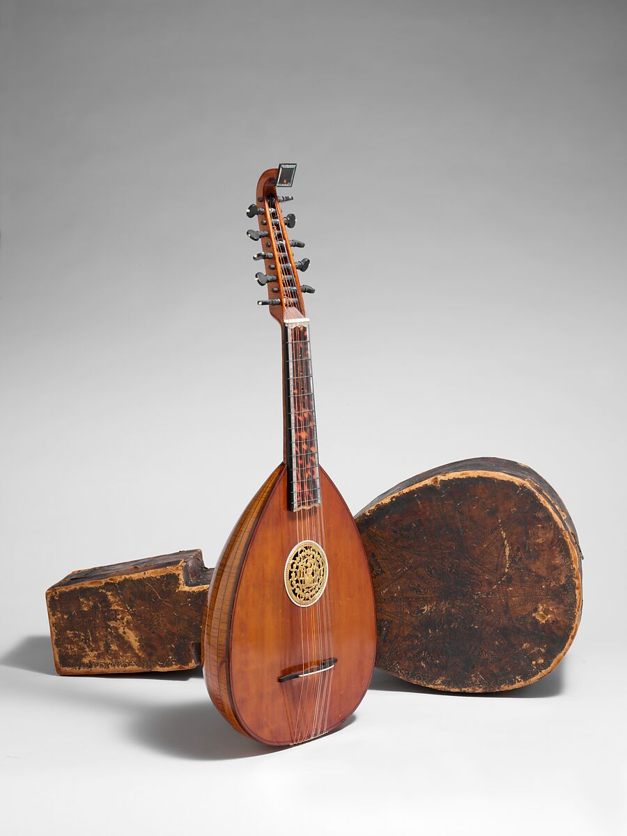 Unusual form with arched back of 21 flamed maple ribs, decorated with engraved mother-of-pearl and tortoiseshell veneer. The label within is illegible. Original tooled leather case. London, late 18th century.