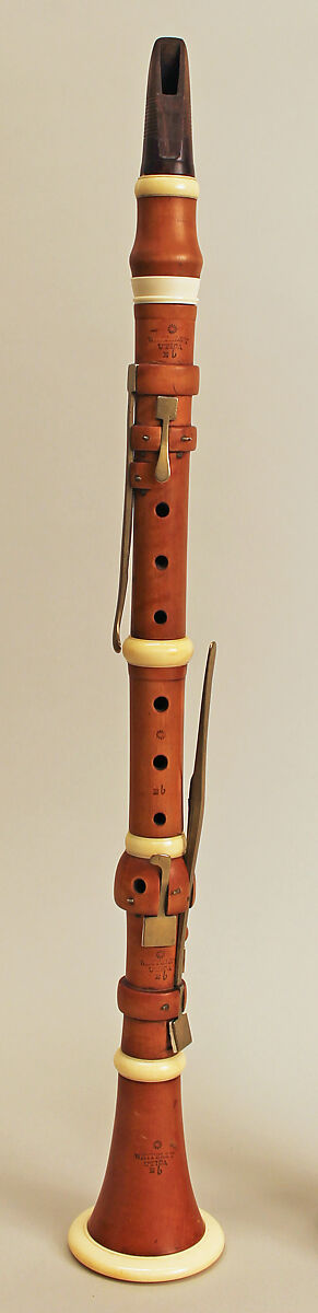 Technical description: Boxwood with ivory ferrules and brass keywork. Six pieces: mouthpiece, barrel, upper section, middle section for the fingers of the right hand, lower section with keys, bell. Long tenon English-style rosewood mouthpiece grooved for cord. English style flask shaped barrel. Square wooden rings. Pins to strengthen the key mounting. Speaker liner projects almost to the centre of the bore. Tone holes undercut. Levers for L4, tone-hole and key for R4 mounted in a bell-shaped swelling. Zig-zag F♯3/C♯5 lever guided in a rudiment of a round turned wooden ring.