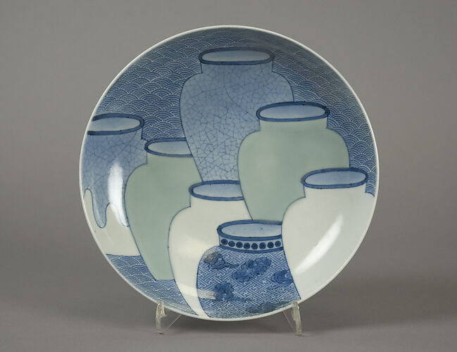 The Hizen region of Kyūshū was the center of early porcelain production in Japan. Although many designs and wares made in Kyūshū were intended for export, works of Hizen ware known as the Nabeshima type were commissioned by the Nabeshima clan and produced at an exclusive kiln. A dish like this example would have been part of a dining service. These sets were frequently sent to the shogun in Edo (Tokyo) as an annual tribute. The cheerful design of jars on this dish features the bold, luminous colors and exacting standards characteristic of the high-quality porcelains produced at the Nabeshima kiln.