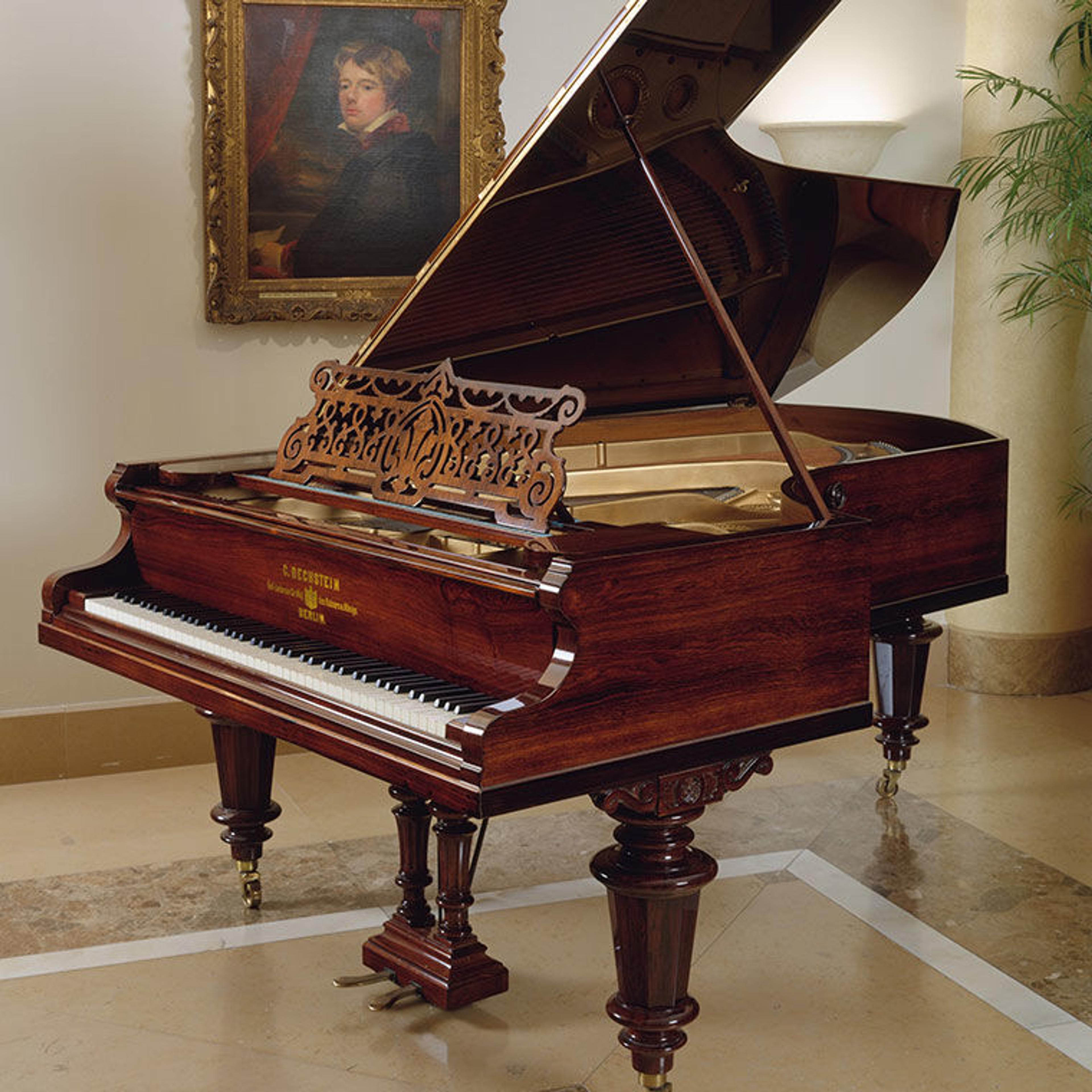 The Met's example is dated to around 1893 based on its serial number. The instrument has a beautiful rosewood case with turned legs. Its length and case style are consistent with the Bechstein Model IV (approximately 7 ft 2 in.). The instrument was restored to playing condition at the time of its acquisition by the Museum, including with the addition of synthetic natural keys.