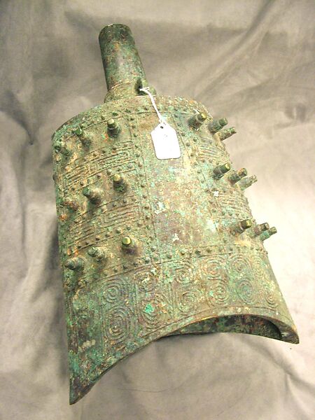 Zhong is a generic name for Chinese clapperless bells which appear elliptical in cross-section and feature a concave mouth of opening at the lower end. This beautiful and unique form helps to generate two distinct pitches when the bell is struck.A detail found on many Chinese bells are nine mei, or nipples, grouped in three rows of three. The mei likely had symbolic meaning; the number nine is auspicious in Chinese cosmology and frequently signified the emperor. The mei also appear to play an important part in the acoustics of the bells. Experiments suggest that they clarify the tone by shaping the vibratory patterns of the bell's surface, helping to stabilize and define the bell's two distinct fundamental pitches. This example is a late nineteenth century reproduction of an ancient bell.