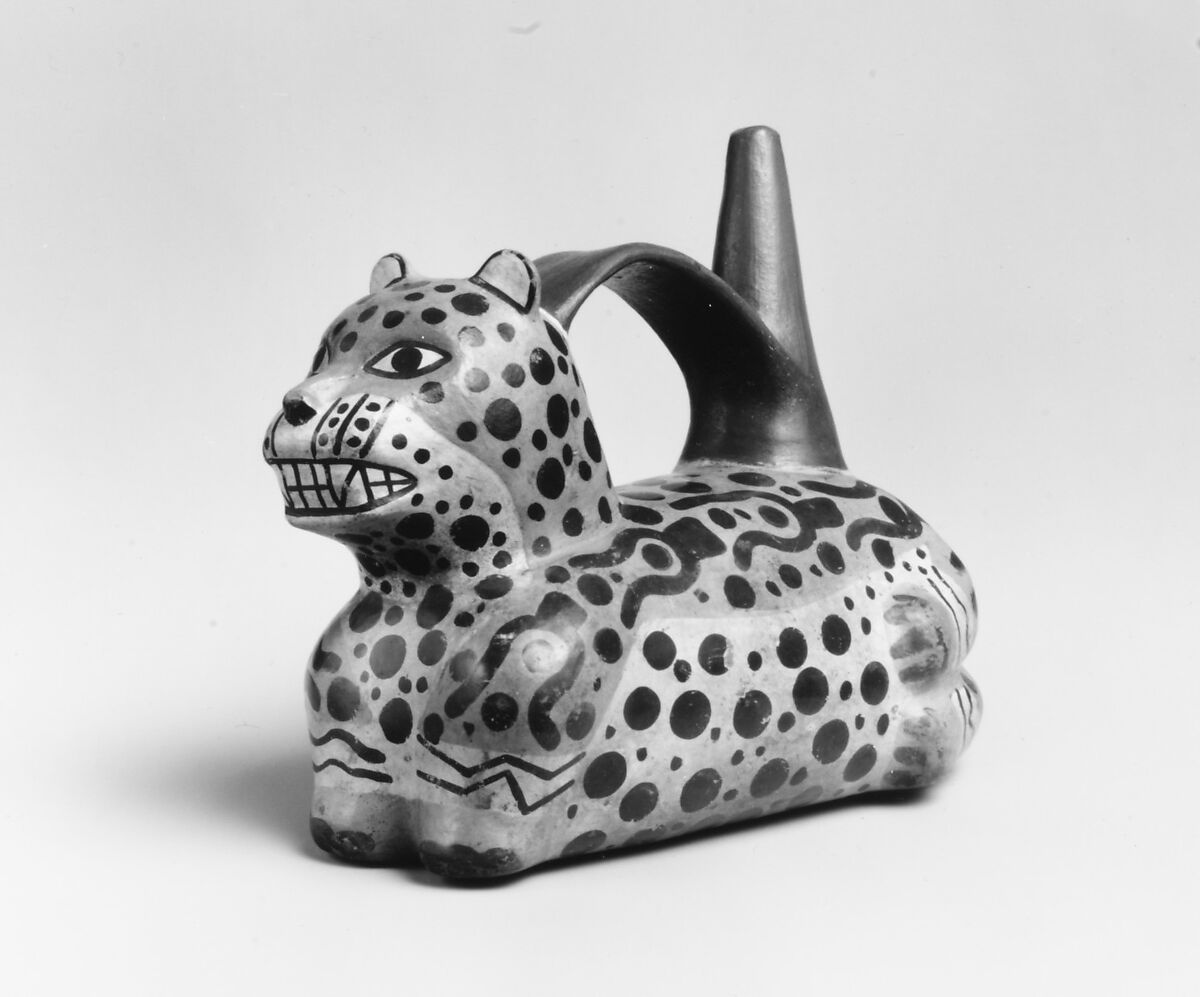 The feline’s striped or ringed tail suggests that it may be a pampas cat. Felines are often symbols of power in ancient Andean art, and the open maw with exposed fangs of the present example is reminiscent of standing and reclining jaguars created artists as early as 1500 BC on Peru’s north and south coasts (see, for example, other works in the Met’s collection, including accession numbers 1979.206.1148; 67.167.11; and 67.167.12).