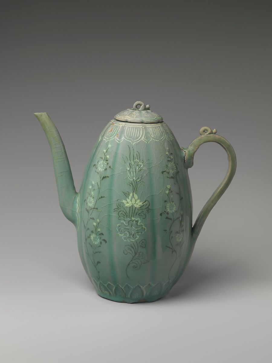 The inlaid patterns that decorate this ewer were created by etching the motifs into a body, filling in the carved space with black and/or white slip, and then firing the entire vessel with a celadon glaze.