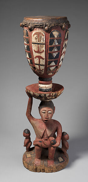 The drum is balanced on the head of a woman figure who is seated, with one arm balancing the drum and the other cradling a baby that she appears to be nursing. There are also two other children at her side. Although it is played exclusively by men, the depiction of a female figure supporting a globular object on her head at the base of the instrument, as is typical of Baga drums, evokes women’s roles in society. Not only do women carry large clay water vessels or baskets for food, notably rice, on their heads, “[w]omen are the bearers of Baga society in every sense of the world,” art historian Frederick Lamp explains (1996: 124). Drums, especially elaborate ones like these, are one of the most important commissions Baga sculptors can receive. Lamp knew of only thirteen Timba in existence.