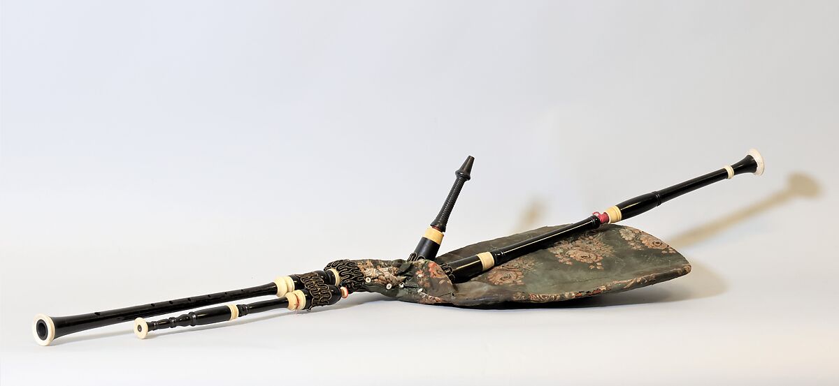 This bagpipe is a mouthblown cabrette with a bass drone. The chanter and tenor drone are inserted into rounded stocks characteristic of this instrument. They are joined internally and are decorated with a black and gold weave. The tenor drone has a narrow bore, as typically found on cabrettes. This drone is reeded with a single reed but would often be muted. The bag is covered with a green silk cover embroidered with flowers in pink hues.