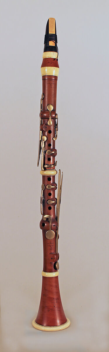 Technical description:Boxwood with ivory ferrules and brass keywork. Five pieces: mouthpiece, barrel, upper section, lower section, and bell. Contemporary socket-type mouthpiece grooved for cord. Flask shaped barrel. All tone-holes under keys lined with brass. Speaker liner projects almost to the centre of the bore. Long tailed throat A♭ key for L2. All cross keys except for C♯4/G♯5 mounted in wooden blocks. This is, because there was not enough space for a wooden block. This key and all side keys mounted in saddles. Duplicate cross key for B♮3/F♯5. Levers for L4 as well as tone-hole and key for R4 mounted in a bell-shaped swelling. Bevelled G♯3/E♭5 touch piece. Guidance for zig-zag F♯3/C♯5 lever.