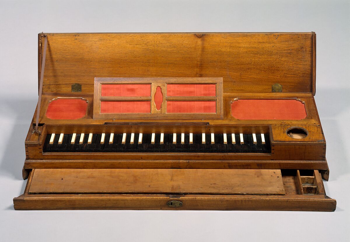 Technical description: Fretted clavichord, European walnut case without legs, drawer extending full width under bottom has leather-hinged lid opening to reveal compartments for paper, ink bottles, etc., with remnants of marbled paper lining, lid support ribbon secured to sliding lid of compartment left of keyboard, fabric-backed music rack hinged into dust panel over strings, separate small panel with large central hole covers front C-e soundboard area, nameboard includes recessed panel that springs up to form music rest at front of rack, C-e³ double-strung, triple-scored ebony naturals with arcade fronts (note letters scratched on heads), pear accidentals topped with ivory, typically carved and lead-weighted basswood key levers numbered beneath, tuning pins identified by inked letters on paper strip, original rack pins and tangents of brass (some pins replaced), brass hardware, fretting in pairs except for Ds and As and bottom octave. (Laurence Libin, 1985)