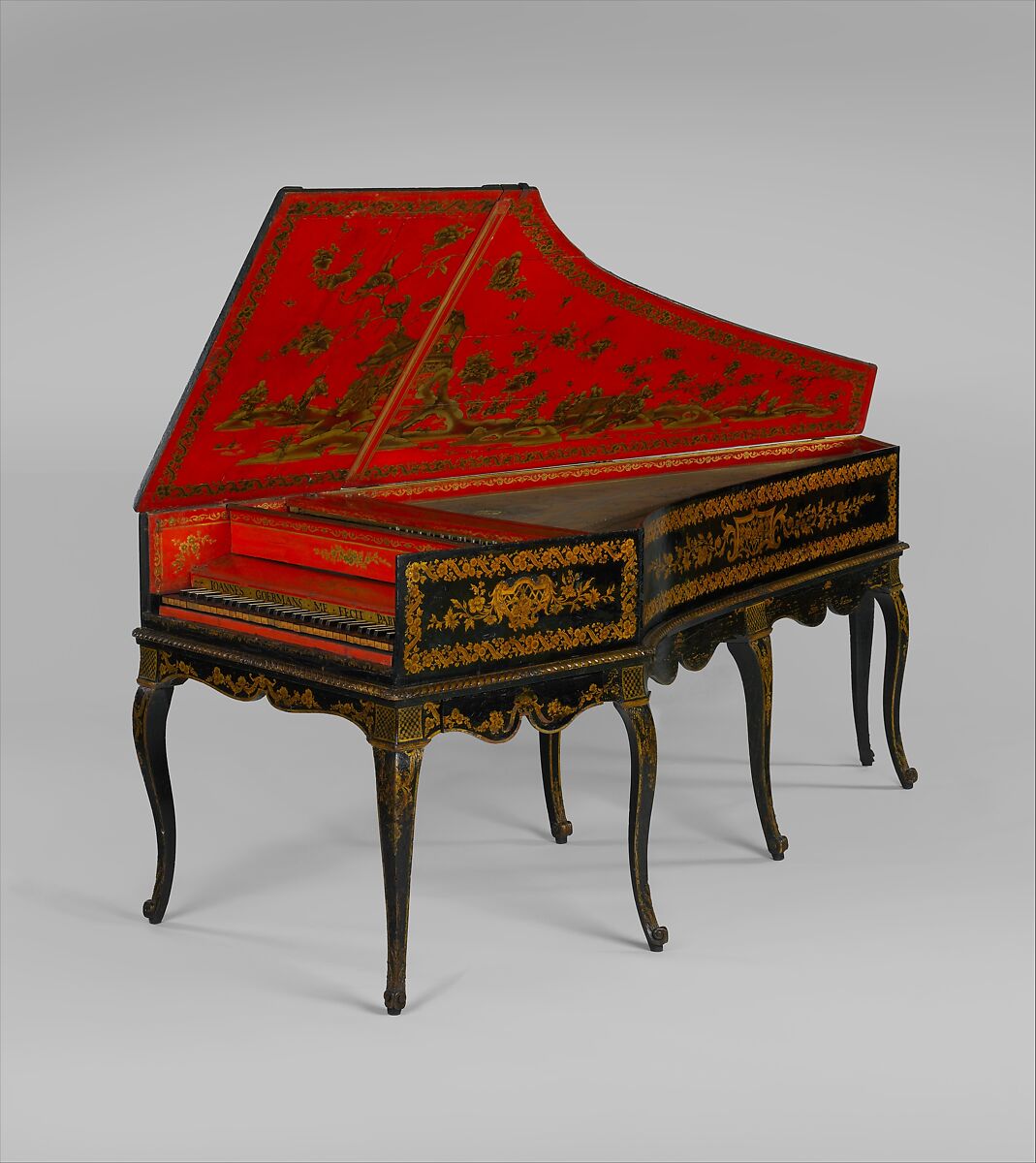 The harpsichord case painted black and decorated in gilt with musical trophies, flowers, floral borders, and small pamels of lattice diaper. Separate stand with seven cabriole legs and scroll feet with carved acanthaus ornaments. The inside of the case is painted red with chinoiserie decorations in black and gold. The inside lid decorations include an Asian style pavilion and multiple Asian musicians playing European instruments including the violin, viola da gamba, hurdy gurdy, and harpsichord. The lid also features exotic birds and large flowers. The sound board is decorated with polychrome flowers and a large parrot. Around the rose is a large floral arrangement and the makers name: IOANNES GOERMANS. The soundhole rose is gilded pewter with an angel and lyre and the initials IG.