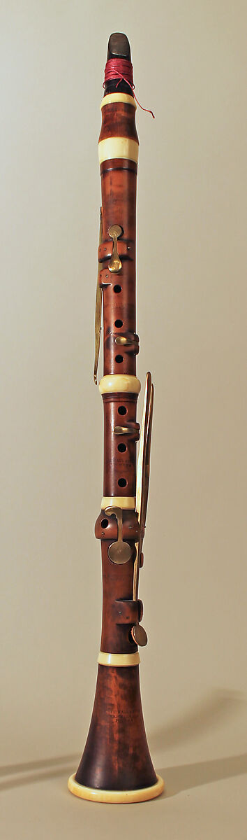 Stained boxwood with ivory ferrules and brass keywork. Six pieces: mouthpiece, barrel, upper section, middle section for the fingers of the right hand, lower section with keys, bell. Levers for L4, tone-hole and key for R4 mounted in a bell-shaped swelling. Long tenon English style mouthpiece of blackwood grooved for cord. Reed with label "Tone Superieur Fance" cut down to fit the mouthpiece attached with red cord. Waisted English style barrel. Speaker liner projects c. 2mm into bore. Guidance for zig-zag L4 levers.