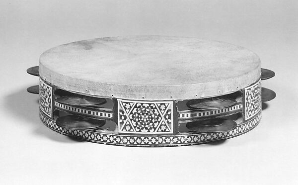 The riqq is a small, circular drum with jingles of the tambourine family. The instrument is used in many parts of the Middle East including Egypt, Iraq, Lebanon, Palestine, and Syria. This is a typical example with decoration suggestive of Syria or Egypt. The body is made of a wooden frame that has a single skin head stretched across the drum that is glued in place and reinforced with a row of tacks. The body is decorated with elaborate geometric inlay (on the interior and exterior of the drum). The wooden frame has six double rows of slots in which are mounted pairs of cymbals (24 in total) that create a bright metallic jingle when the instrument is struck or shaken.