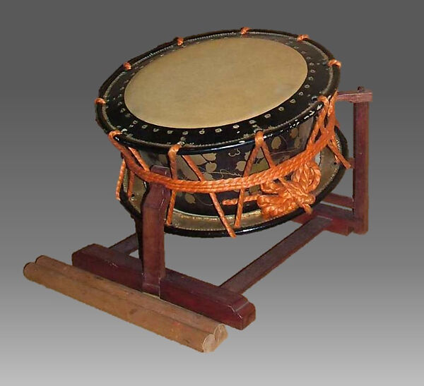 Taiko or Daiko is generic for Japanese drums of all sizes and shapes. Some, like the kakko, the hourglass-shaped tsuzumi and this drum have ring frames that secure the skin heads. Shimedaiko refers to shallow bodied drums like this nōdaiko, so named for its use in nō theatre where the player uses two cylindrical wood beaters to play named patterns.