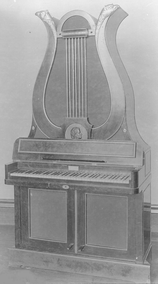 Technical description: Upright (Lyre) piano with pedalboard: mahogany veneer case with metallic striping inlaid on nameboard and inner side of cheeks, upper portion lyre-shaped with gilt border and shafts representing springs; lyre arms extending from a central medallion bearing a relief profile of Mozart? backing on lyre panel; pedal action mounted on case floor, separate pedal soundboard and strings facing rear of case; compass manual FF-f4 (73 keys), pedal CC-d? (27 keys); ivory naturals, ebony accidentals, 2 pedals with hitches for dampers and "una corda" ; Action: manual, German "hangende" action with escapement, backcheck and spring return; damper arm lifted by back of key lever; pedal, German "stehende" action with escapement, back of key lever; pedal, German "stehende action with escapement, backcheck, spring return; pedalboard missing. Stringing: manual, lowest 22 notes, double-strung, rest triple-strung; lowest 8 notes wound with brass; pedal, double-strung throughout, lowest 13? notes originally wound with brass; pedal, double-strung throughout, lowest 13? notes originally wound. (L. Libin 19 Oct 76).